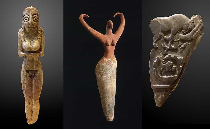 Артефакти на Египет от праисторическия период, от 4400 до 3100 пр.н.е. Първи ред отгоре вляво: фигурка от слонова кост на Бадари, буркан от Накада, женска фигура, рисувана теракота (3 400 - 3 500 г. пр. Хр.). Втори ред: ваза от диорит, нож за кремък, козметична палитра.