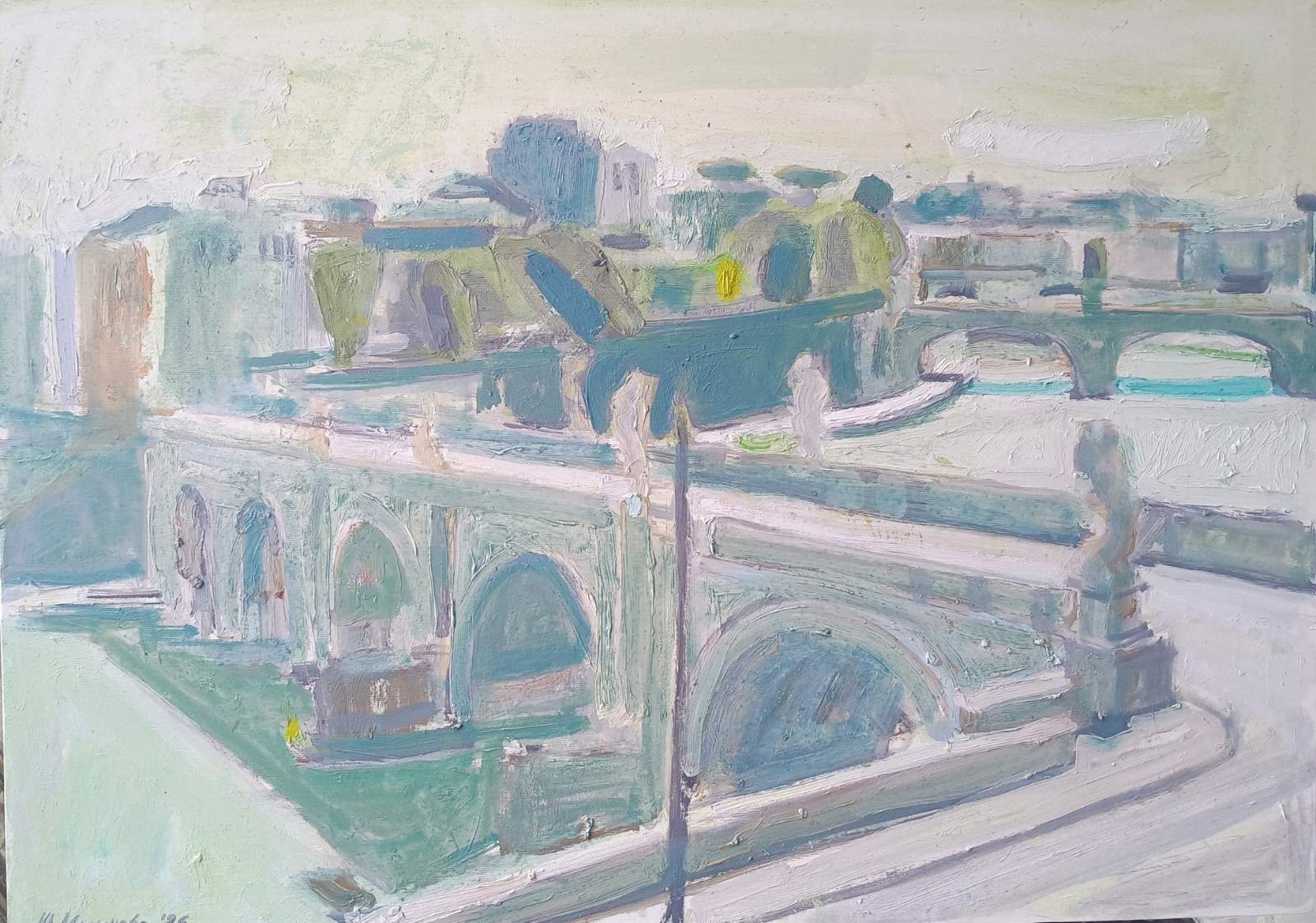 В някои от платната формите като че ли едвам се раждат от цвета - къщи, дървета, силуети на статуи се появяват сякаш само намек. Те не са конкретика, а по-скоро усещане за фокус. Градът тук е атмосфера - мъгла, светлина, дъх. Маслената боя на места е насложена толкова фино, че структурата на платното прозира през цвета. Рим се явява като привидение - на прага между видяното и сънуваното, сякаш не напълно изграден, а току що зараждащ се.В други платна погледът се задържа - върху мост, върху фасада, арка или уличен детайл. Композицията се сгъстява, материята става по-плътна, а формата - по-устойчива. Но дори и тогава, заобикалящото пространство не настоява за внимание. Остава отворено, недоизказано като фон на едно преживяване.