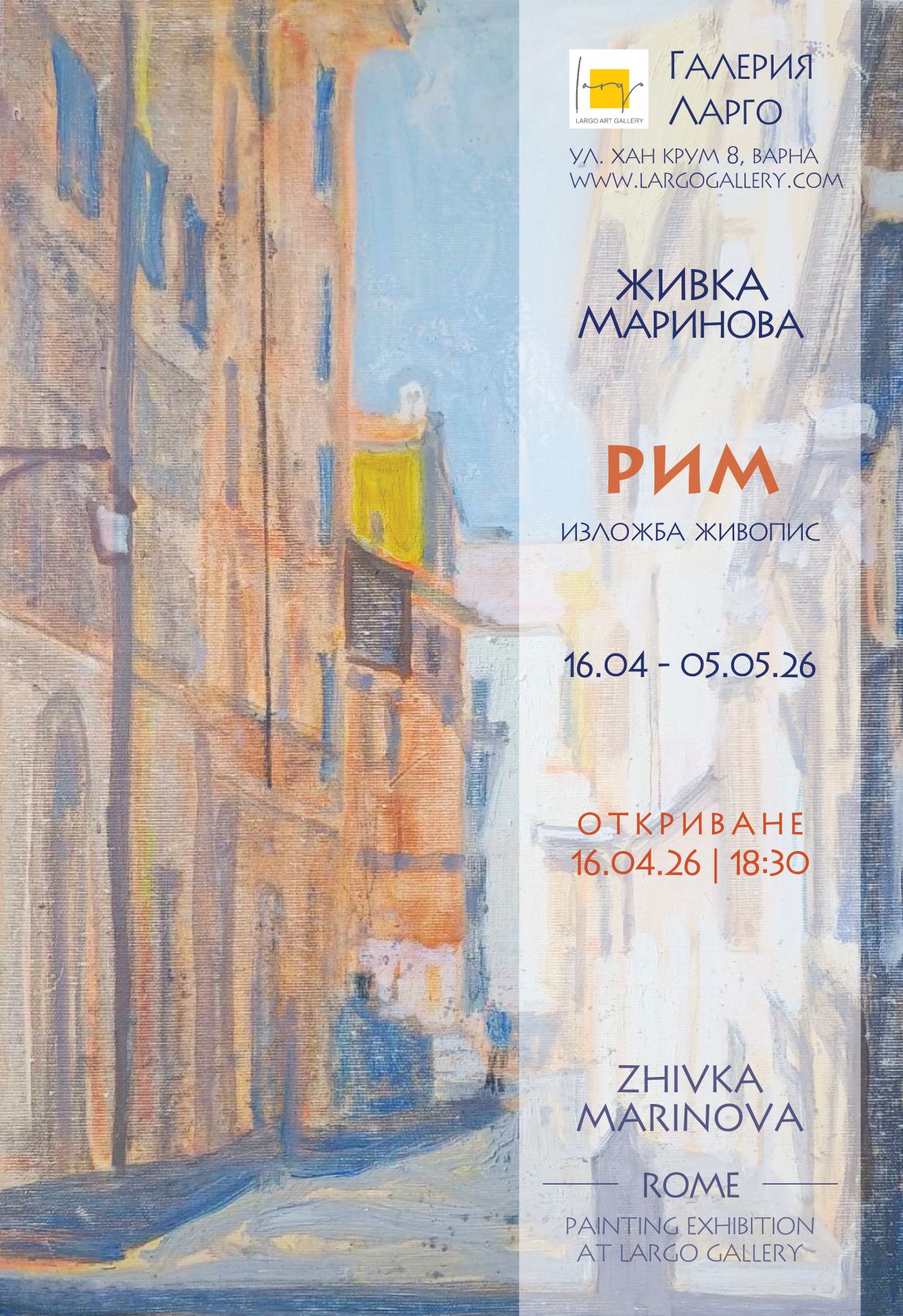 Галерия „Ларго” представя самостоятелната изложба живопис на Живка Маринова, озаглавена “Рим”. След няколко сборни изложби в пространството на галерията, това е първата самостоятелна изява на авторката в „Ларго“. В настоящата експозиция ще се насладим на платна, обединени от темата за Рим - градът, в който времето е издълбано в човешката история. Град, издигнат от камък и памет. Град, разкриващ себе си постепенно - сякаш спомен, който изплува от съзнанието.