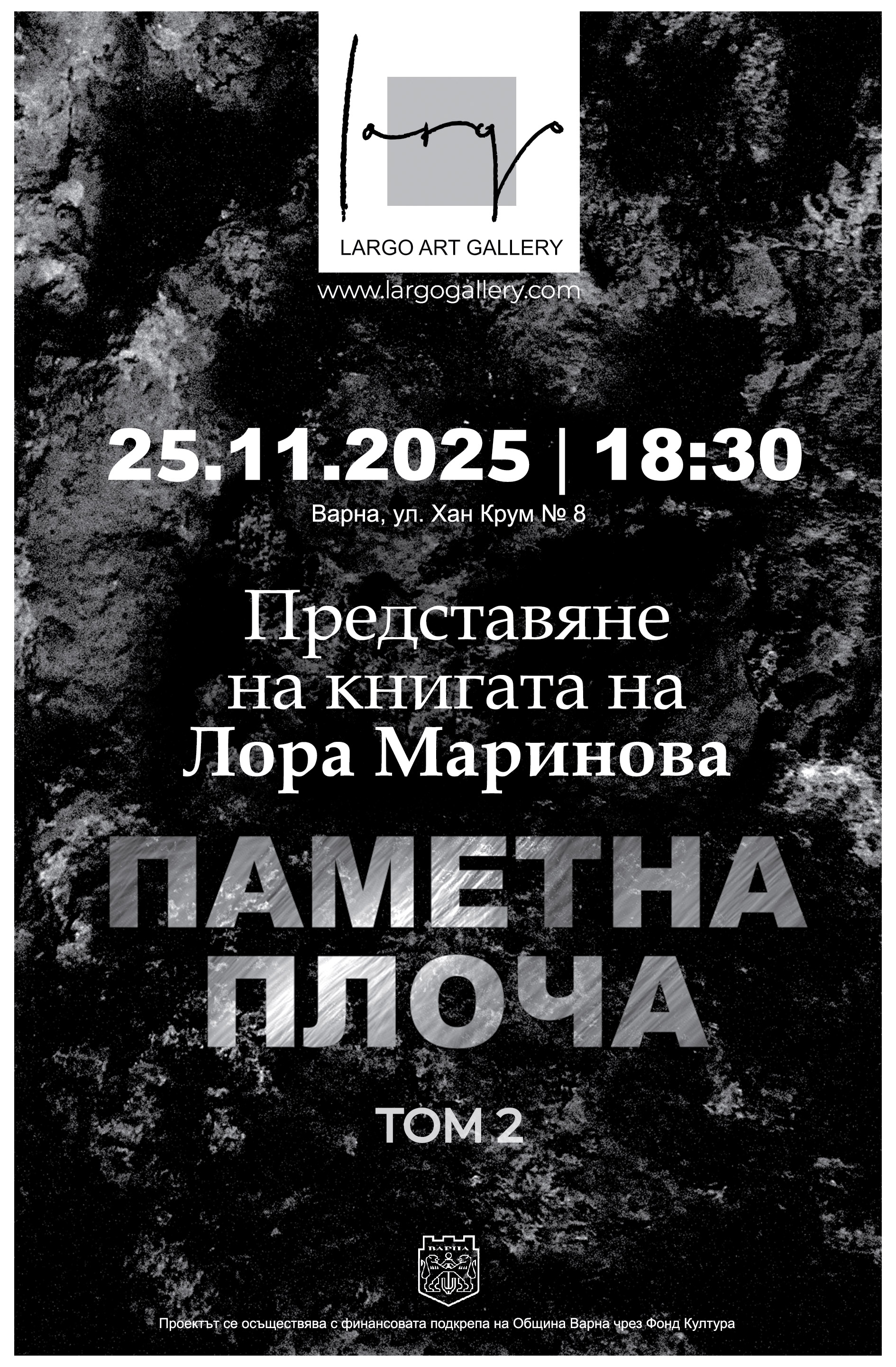 На 25 ноември 2025 година от 18:30 часа в галерия Ларго ще бъде представен вторият том от книгата на Лора Маринова „Паметна плоча“. Лора, позната като великолепен художник и дългогодишен сценограф на Варненската опера, има зад гърба си вече три издадени стихосбирки. „Паметна плоча“ е биография на нейния баща, художника Янко Маринов, в четири тома.