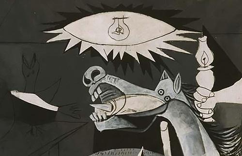 На 20 май картината е готова: бяла, черна и сива, с размери 3,49×7,76 м. Изборът на черно-бяла палитра предава цветовете на фотографиите във вестниците и отразява безжизнената природа на войната. Нито едно пряко споменаване на гражданска война или бомбардировки – и в същото време символично обобщение на всяка война и безполезна смърт. Поетът Пол Елюар, приятел на художника, посещава студиото и се разплаква, когато вижда картината. Казва, че Пикасо „държи пламъка в ръцете си и рисува с огън“.