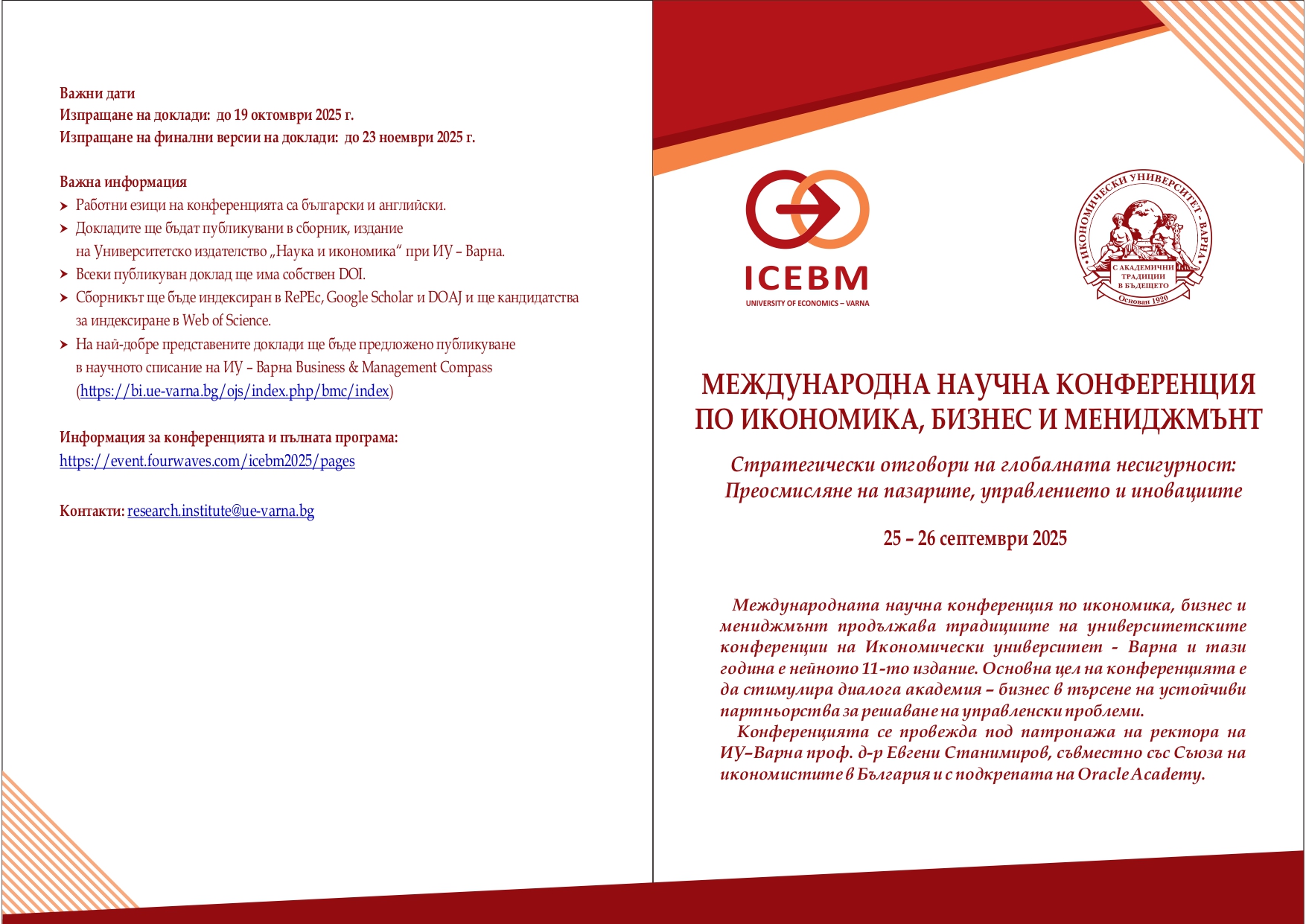 На 25 и 26 септември 2025 г. в Икономически университет – Варна ще се проведе Международната научна конференция по икономика, бизнес и мениджмънт (ICEBM 2025). Тази година форумът протича под надслов „Стратегически отговори на глобалната несигурност: Преосмисляне на пазарите, управлението и иновациите“. Основна цел на събитието е да стимулира диалога между академичната общност и бизнеса в търсене на устойчиви партньорства за решаване на съвременни управленски предизвикателства.