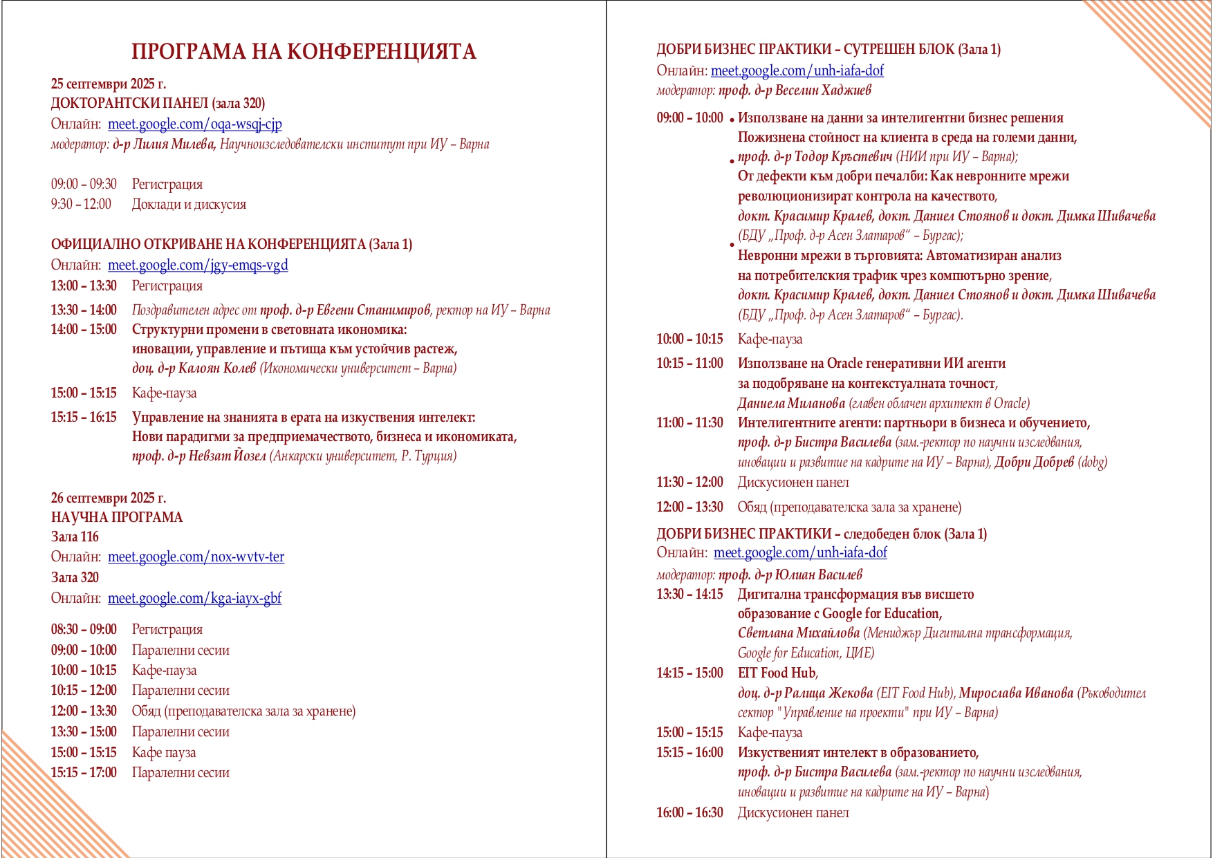 Изключителен интерес представлява специалния панел „Добри бизнес практики“, който ще се проведе на 26 септември 2025 г. в Зала 1 на Икономически университет - Варна и ще се излъчва онлайн. В рамките на няколко дискусионни панела ще бъдат разгледани въпроси, свързани с използването на данни за вземане на бизнес решения, ролята на интелигентните агенти и приложението на изкуствения интелект в образованието. Като допълнителен акцент в програмата със свои презентации ще се включат представители на Oracle Academy, Google и EIT Food Hub.
