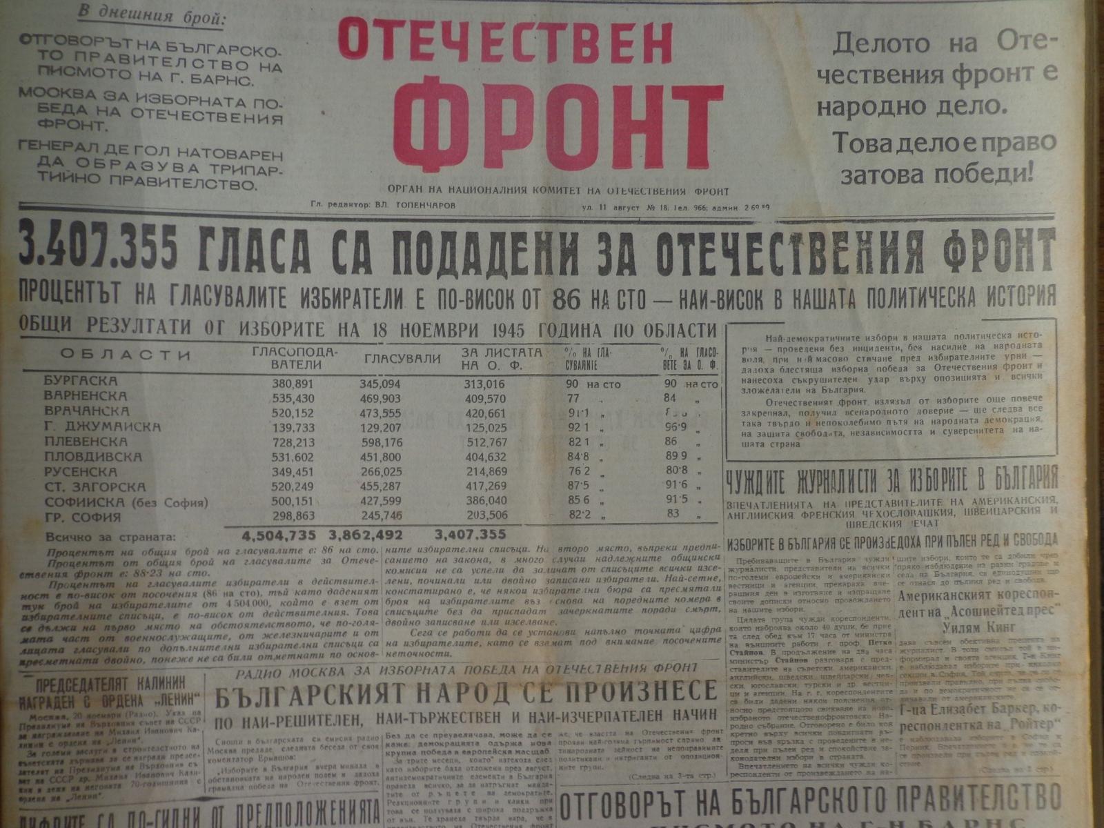 2. От 9 септември 1944 г. до 9 май 1945 г. През този период „централна задача на Отечествения фронт бе: „Всичко за фронта, всичко за бързото завоюване на окончателната победа над фашизма, над хитлеристките злодеи и разбойници… Период на разпространение и укрепване на ОФ“;