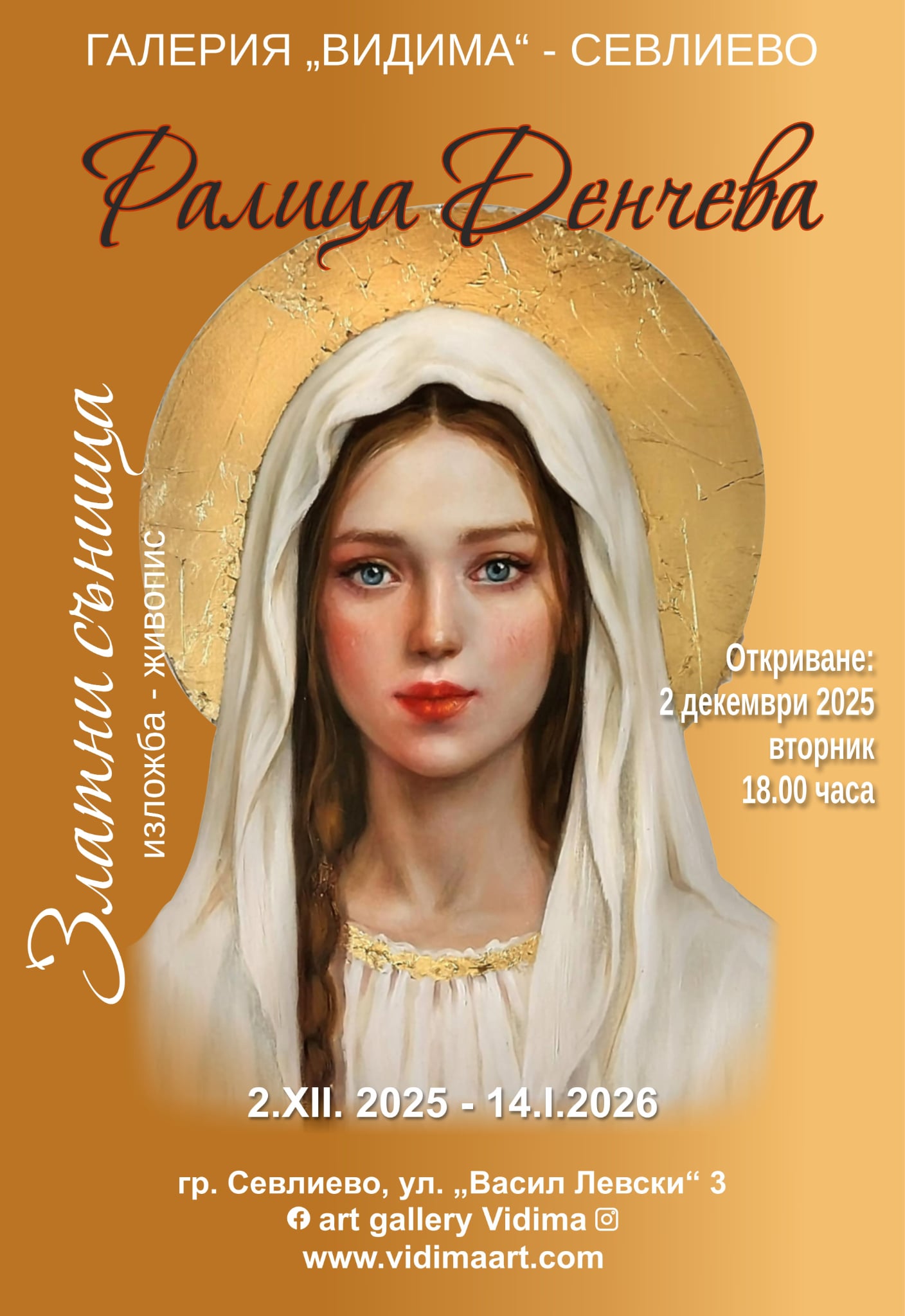 В изложбата „Златни сънища“ Ралица Денчевапредставя най-новите си произведения,символичен коледен и новогодишен подарък за местната публика. Такатя ни открехва вратата към своя вътрешен свят, колкото чувствен, толкова и сакрален, и ни кани в градината на своята душа – небесен оазис, където се раждат златните сънища. Там, където женското лице на Бога разказва за любовта и красотата не само като екстаз и пламък в сърцето, но и като тиха, трепетна носталгия по нещо недостижимо и изгубено,където тъгата е лека и ефирна, а жената е не само вдъхновение, но и портал към вечността.