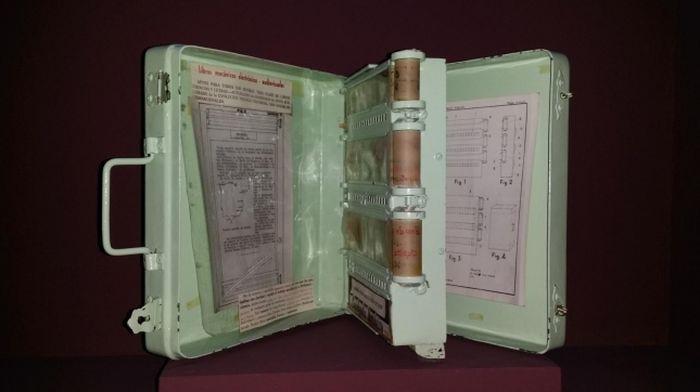 И така, ето ви прабабата на нашите съвременни електронни книги! Това творение е ярка илюстрация какво би се случило, ако електронните книги приличаха повече на хартиени, отколкото на таблети. Уникалната книга е създадена от испанската писателка и учителка Анхела Роблес и се захранва със сгъстен въздух. Най-удивителното е, че в нея е възможно да се заредят капсули с различни текстове и дори да се увеличат отделни фрагменти! В бъдеще създателката ѝ планирала да добави звуци, калкулатор и лампа за четене.